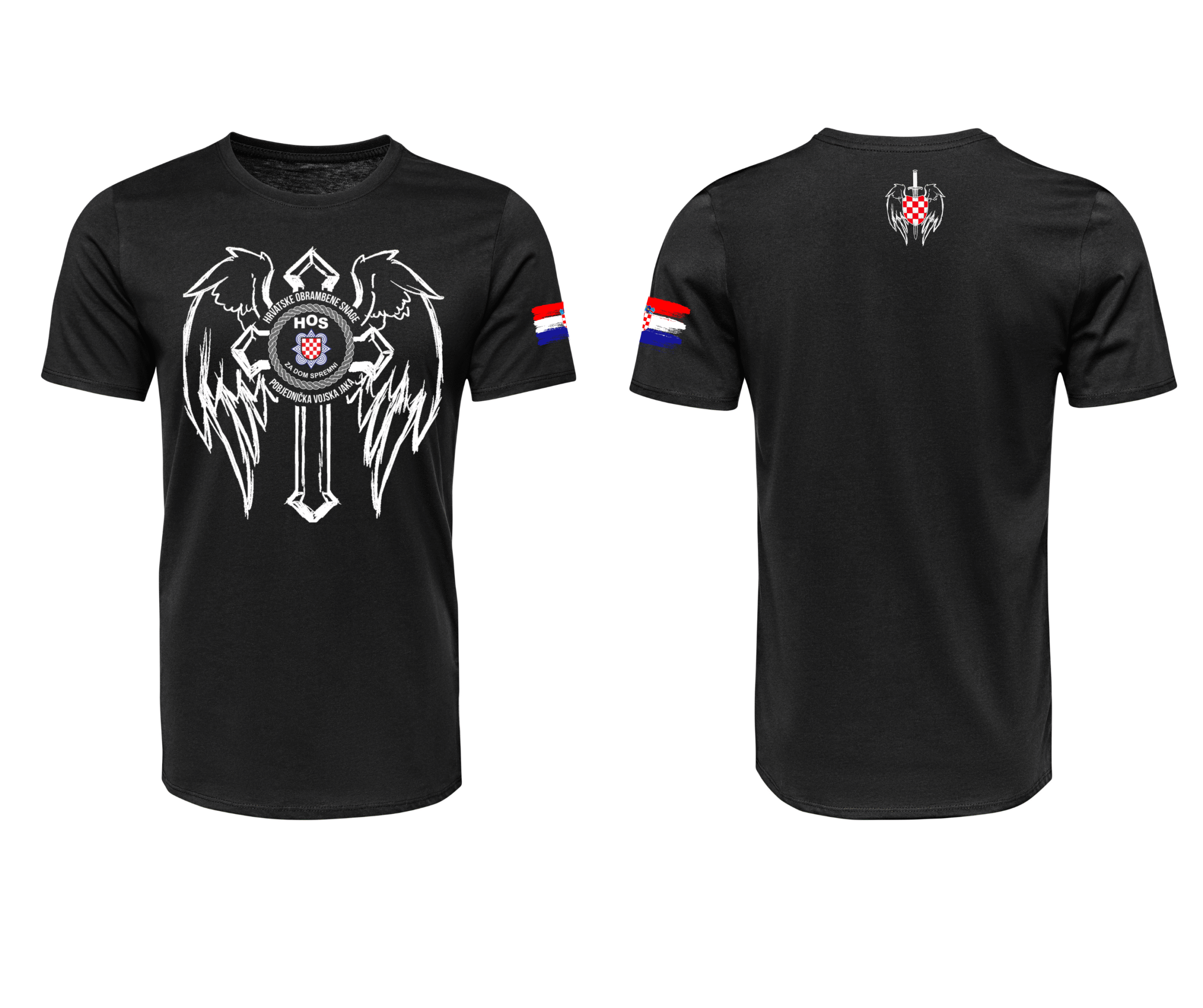 Na prednjem dijelu dominira upečatljiv dizajn: krilati križ s grbom i natpisom “Za dom spremni – HOS”, okružen snažnim bijelim linijama koje simboliziraju slobodu, snagu i žrtvu.